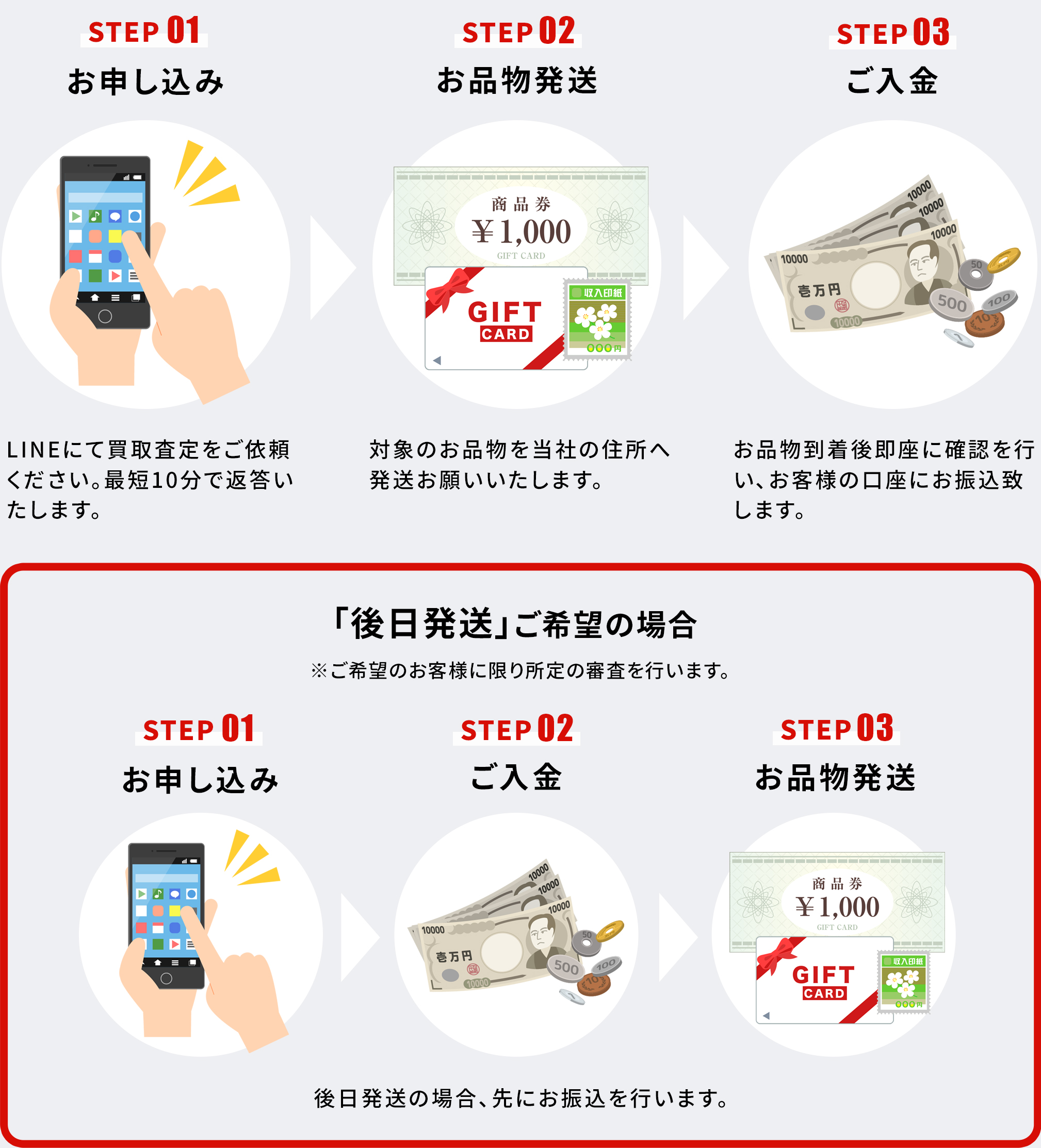 後日郵送とは、原則としては商品を先に送っていただき買取代金の査定と支払をするところ、商品の種類などによっては先に買取代金を支払い、後日に商品を郵送で送ることで大丈夫という仕組みです。そのため、お客様の信用調査のため、弊社基準の査定と簡単なヒアリングを行います。ヒアリングは最短10分程度です。時間帯や申込みの多い時期では、査定時間が長くなる場合があります。【※お手元に商品がある場合のみ後日郵送が利用可能です。】